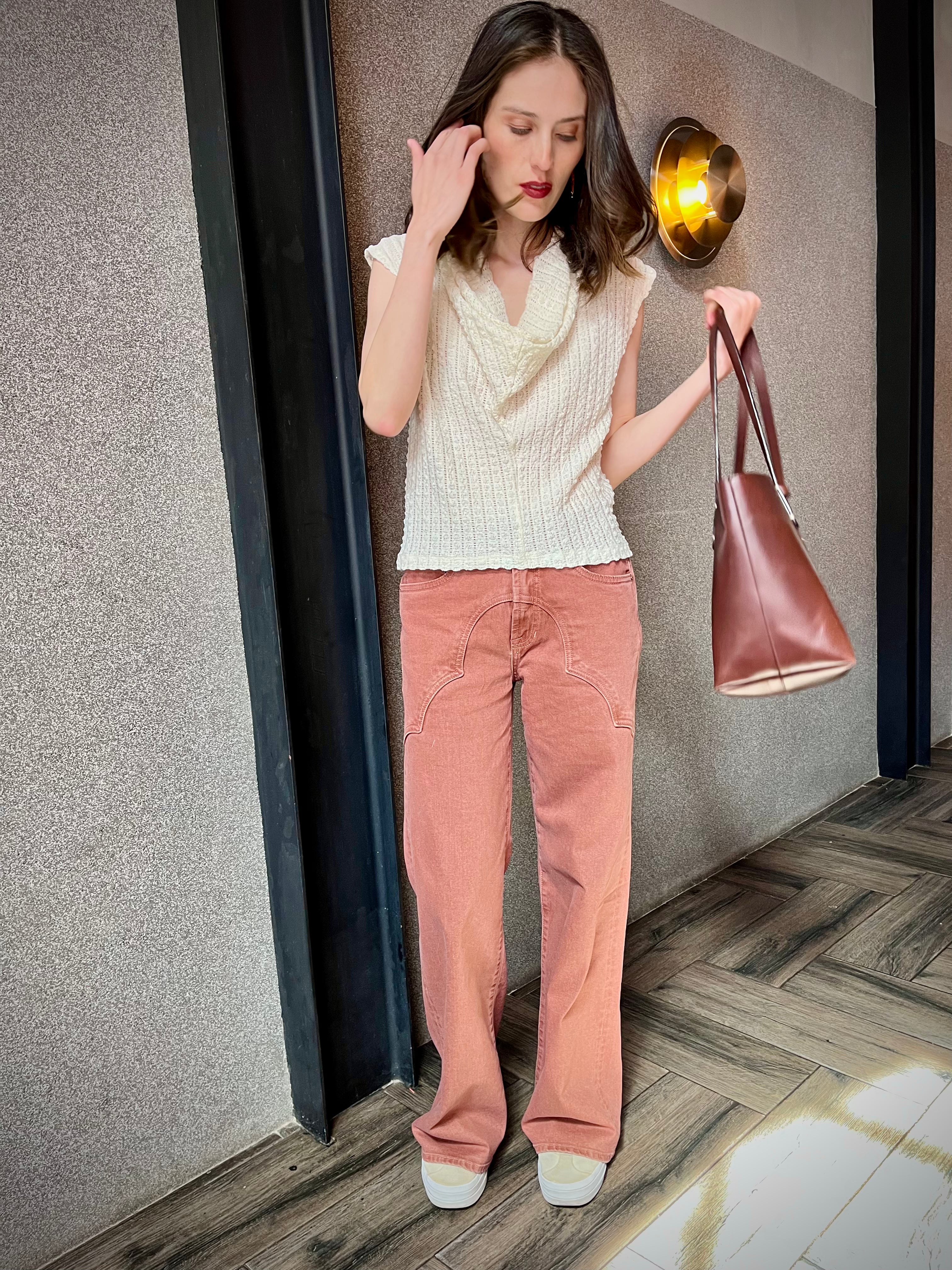 Top en blonda con stretch cuello caído y blusa con stretch Licra corrugada Modelo talla small disponible en S y M