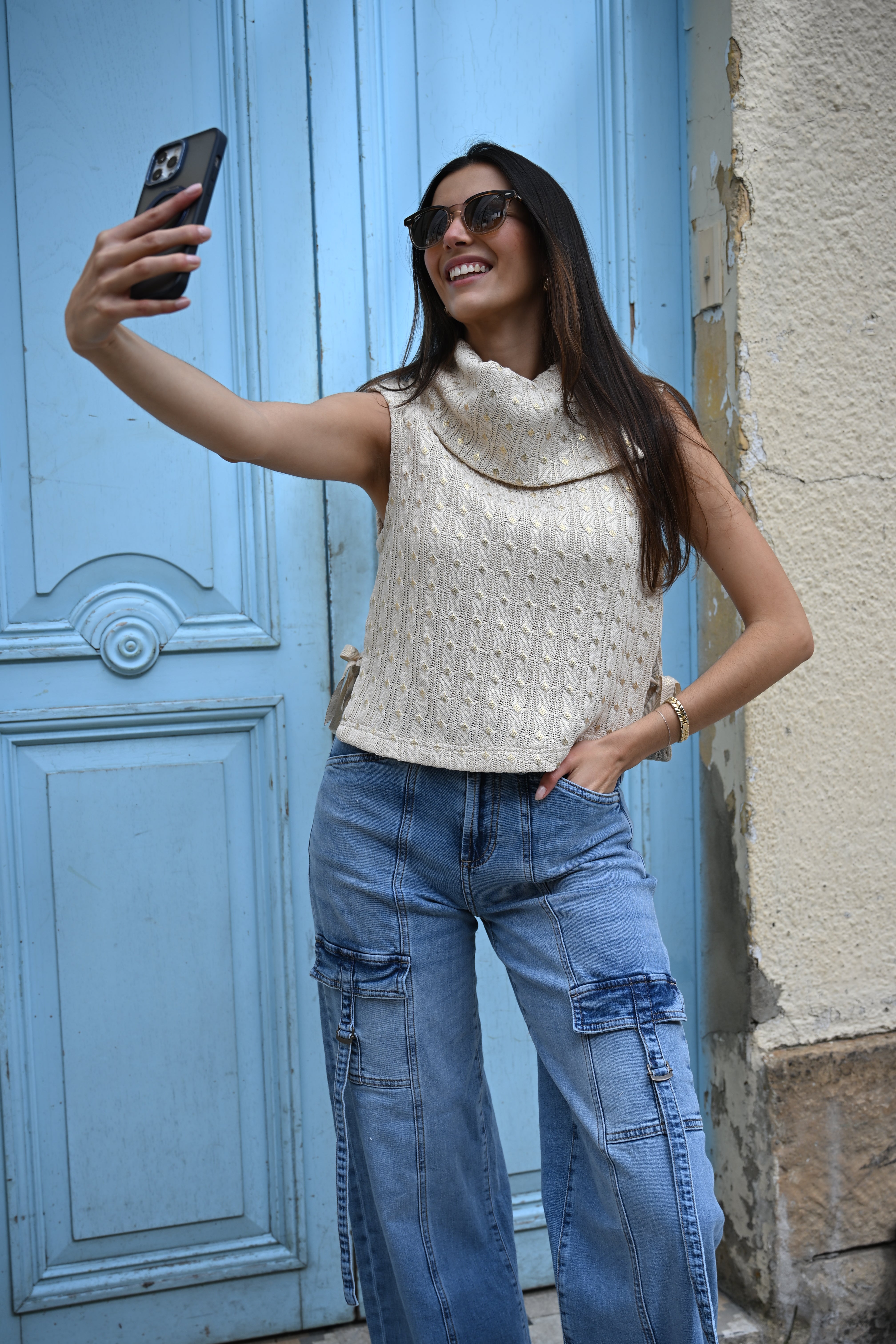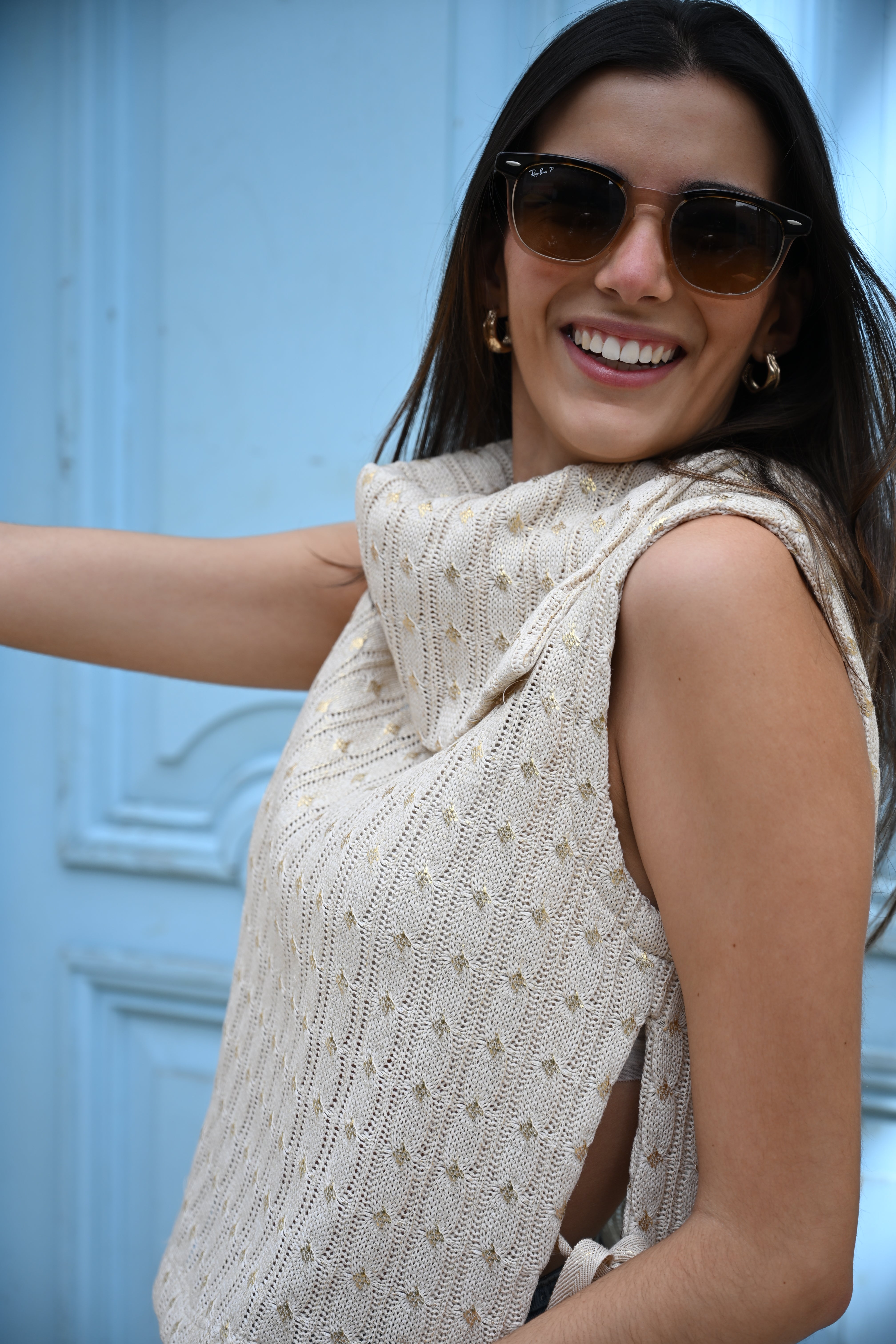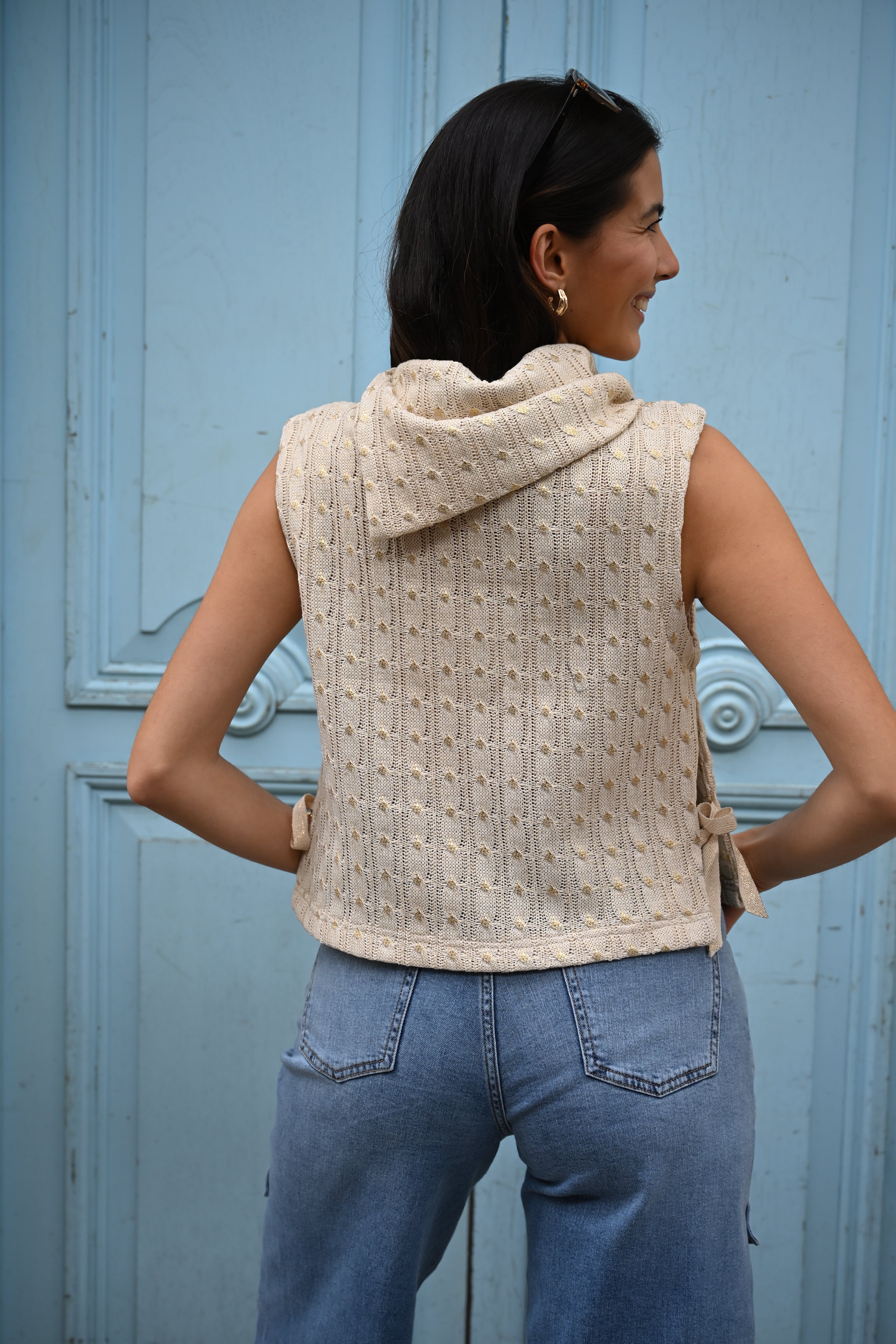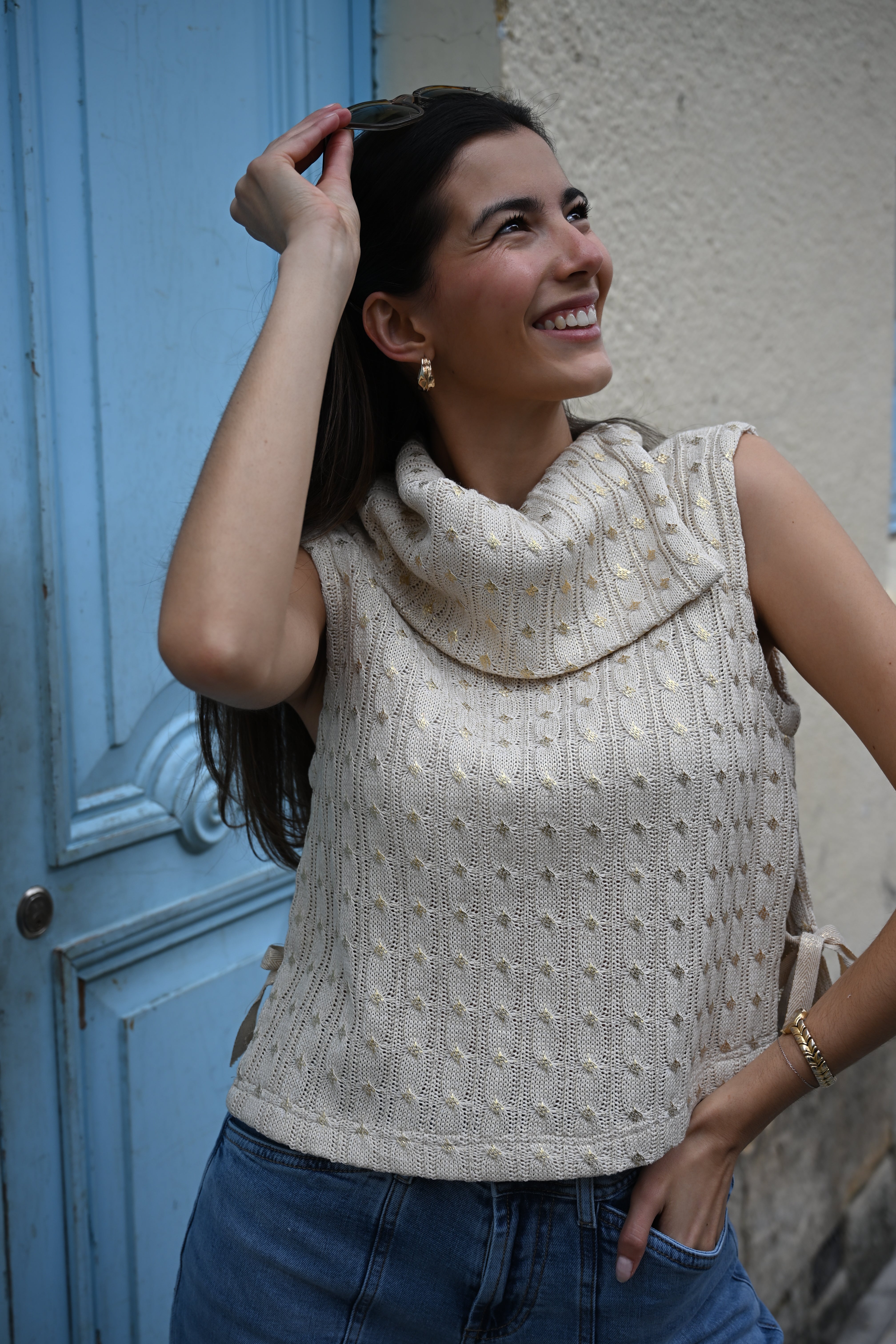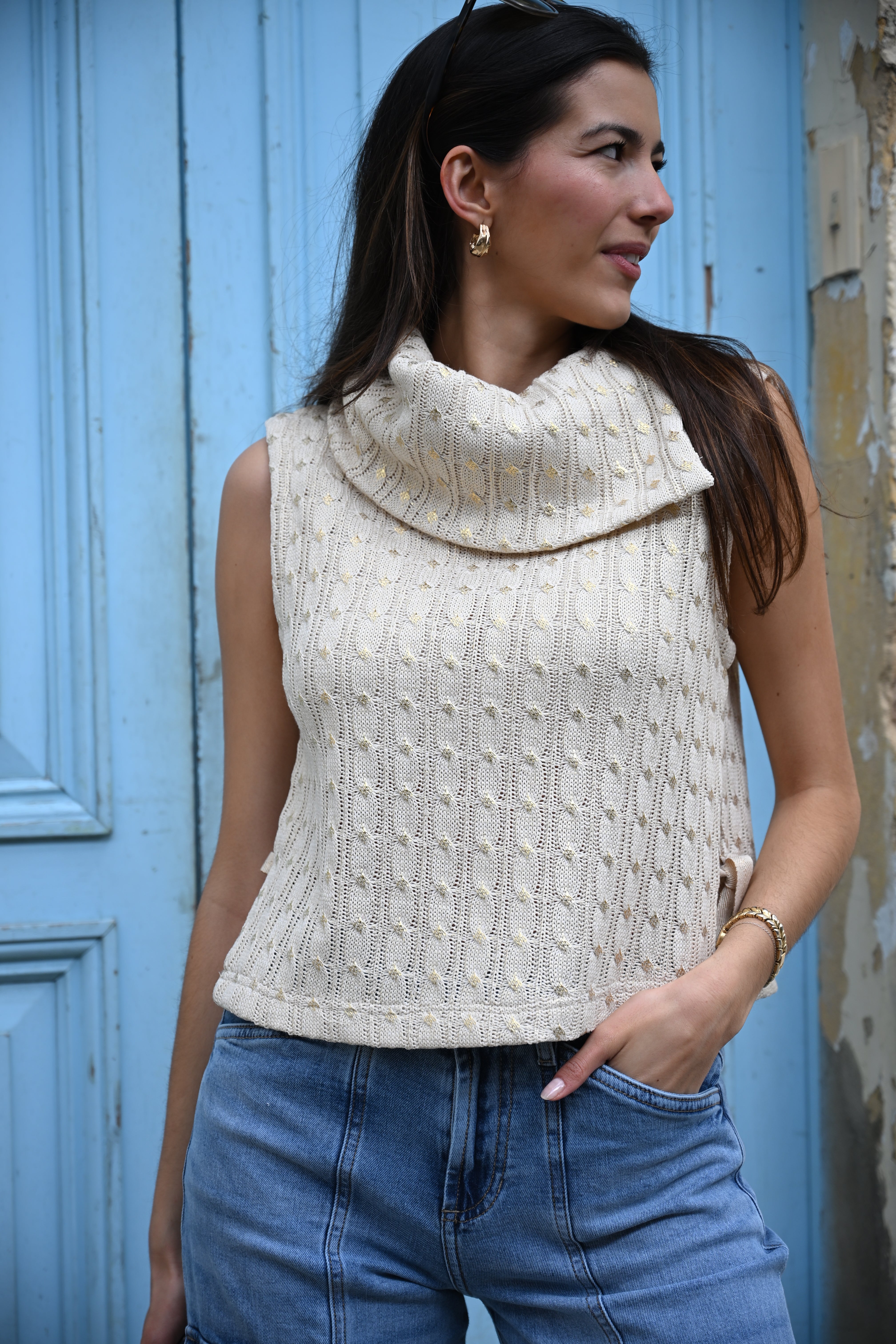 El Chaleco Arte Deja Vu es una pieza de diseño pensada para destacar. Su tejido trenzado en algodón y los detalles en dorado crean una prenda elegante, versátil y muy especial. Perfecto para elevar un look con jeans o complementar outfits más sofisticados.