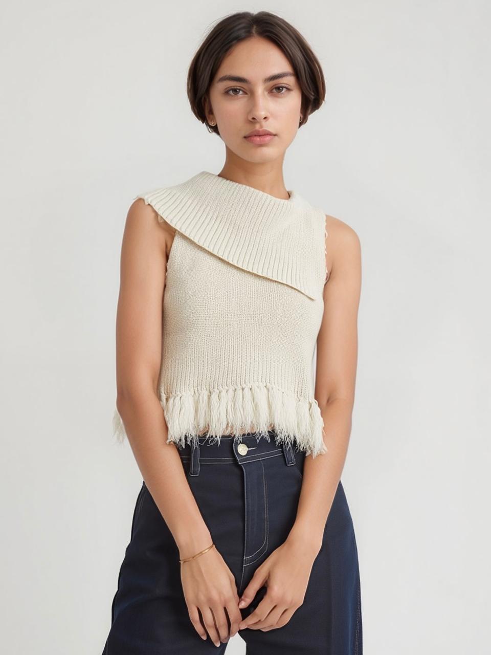 sw tejido con lurex y terminado en flecos , moderno y divertido. un basico con estilo para tu closet. | hilo de algodon y lurex | Modelo talla S Sirve a talla s y m ya que el tejido sede a varios cuerpos. |